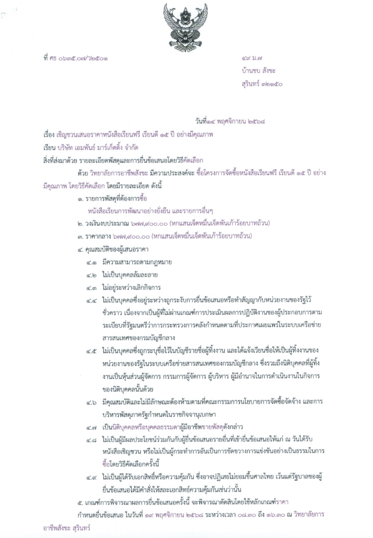เชิญชวนเสนอราคาหนังสือเรียนฟรี เรียนดี 15 ปีอย่างมีคุณภาพ บริษัท เอมพันธ์ มาร์เก็ตติ้ง จำกัด