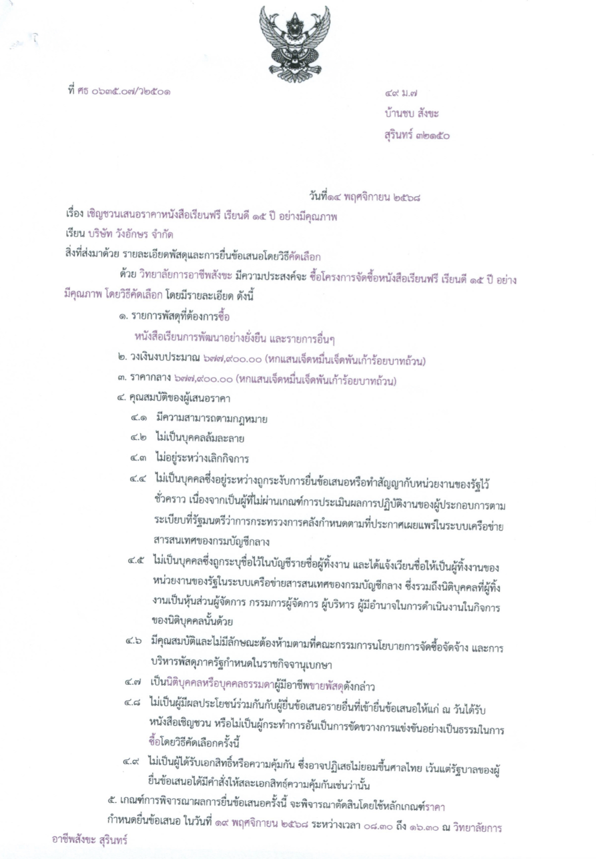 เชิญชวนเสนอราคาหนังสือเรียนฟรี เรียนดี 15 ปีอย่างมีคุณภาพ บริษัท วังอักษร จำกัด