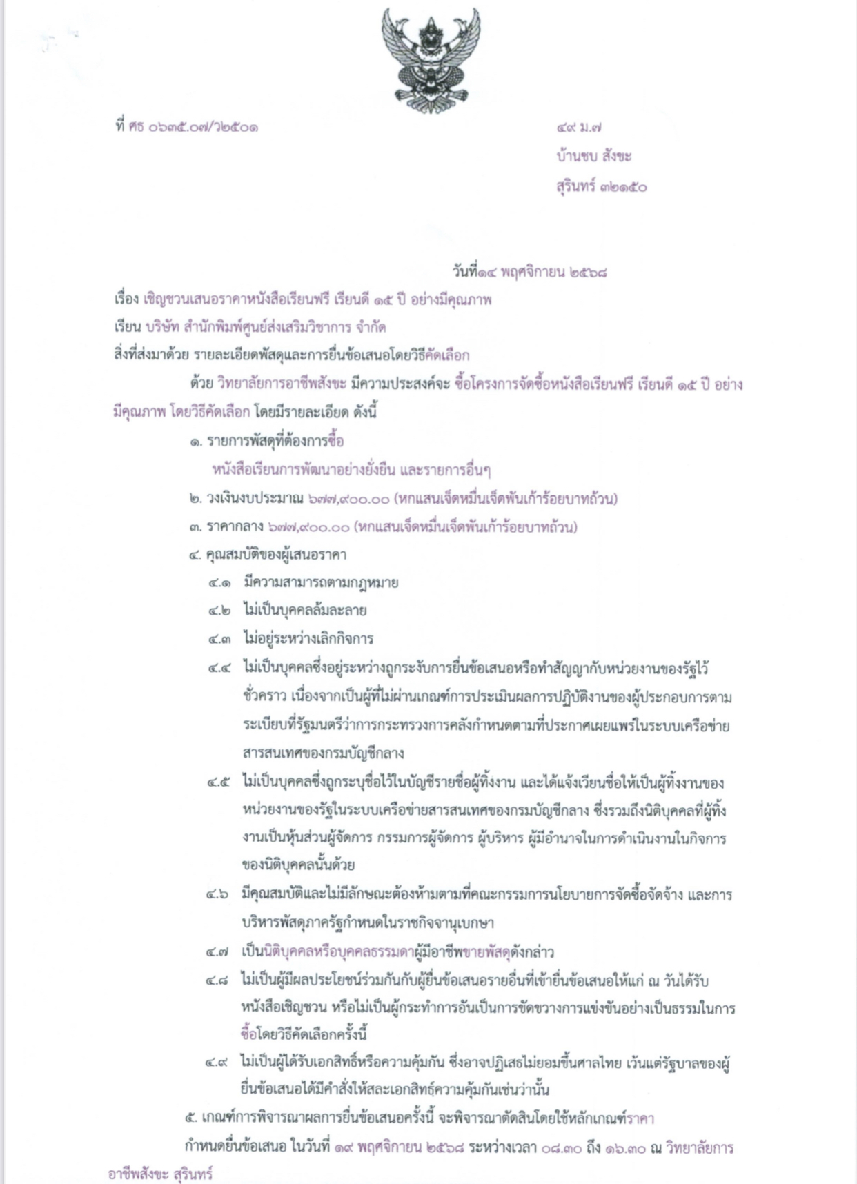 เชิญชวนเสนอราคาหนังสือเรียนฟรี เรียนดี 15 ปีอย่างมีคุณภาพ บริษัท สำนักพิมพ์ศูนย์ส่งเสริมวิชาการ จำกัด