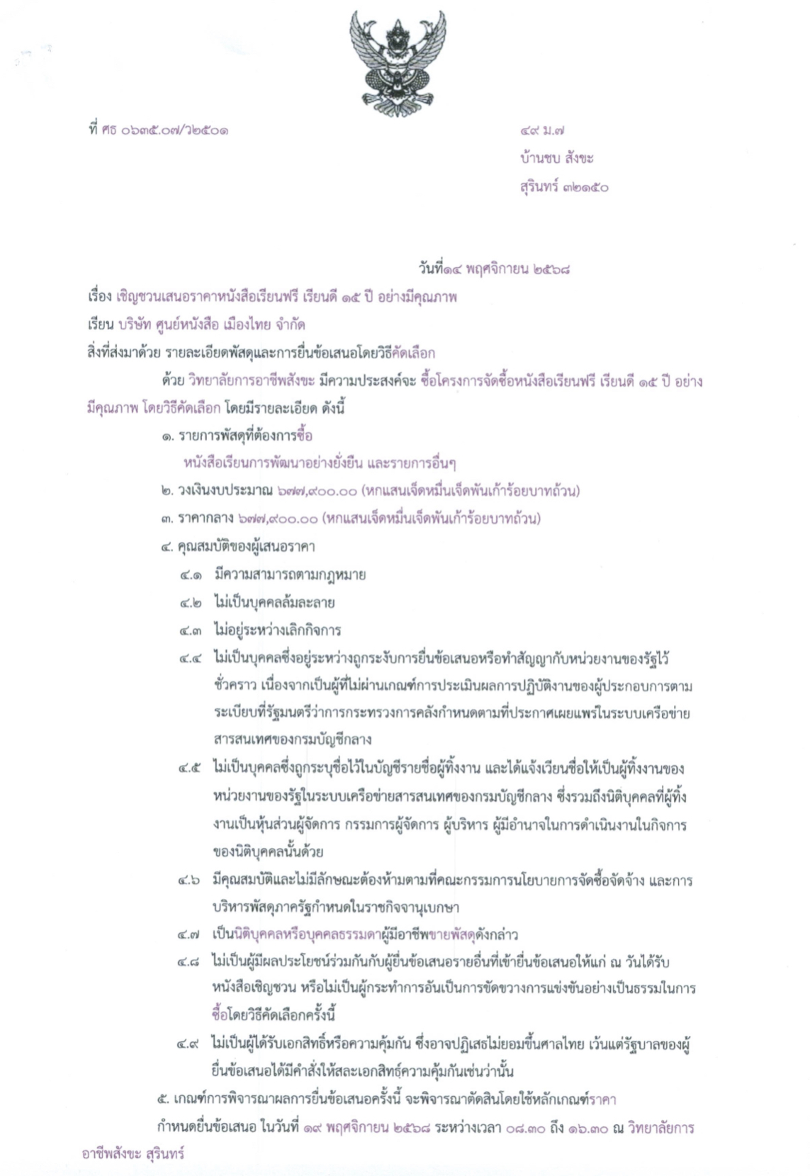 เชิญชวนเสนอราคาหนังสือเรียนฟรี เรียนดี 15 ปี อย่างมีคุณภาพ บริษัท ศูนย์หนังสือ เมืองไทย จำกัด