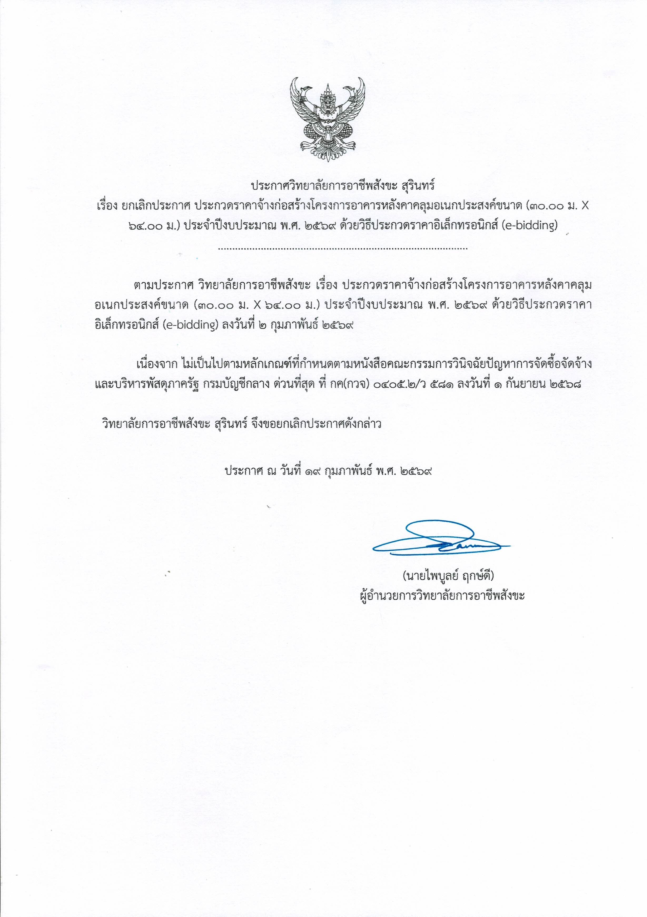 ประกาศวิทยาลัยการอาชีพสังขะเรื่อง ยกเลิกประกาศ ประกวดราคาจ้างก่อสร้างโครงการอาคารหลังคาคลุมอเนกประสงค์ขนาด (๓๐.๐๐ ม. X ๖๔.๐๐ ม.) ประจำปีงบประมาณ พ.ศ. ๒๕๖๙ ด้วยวิธีประกวดราคาอิเล็กทรอนิกส์ (e-bidding)