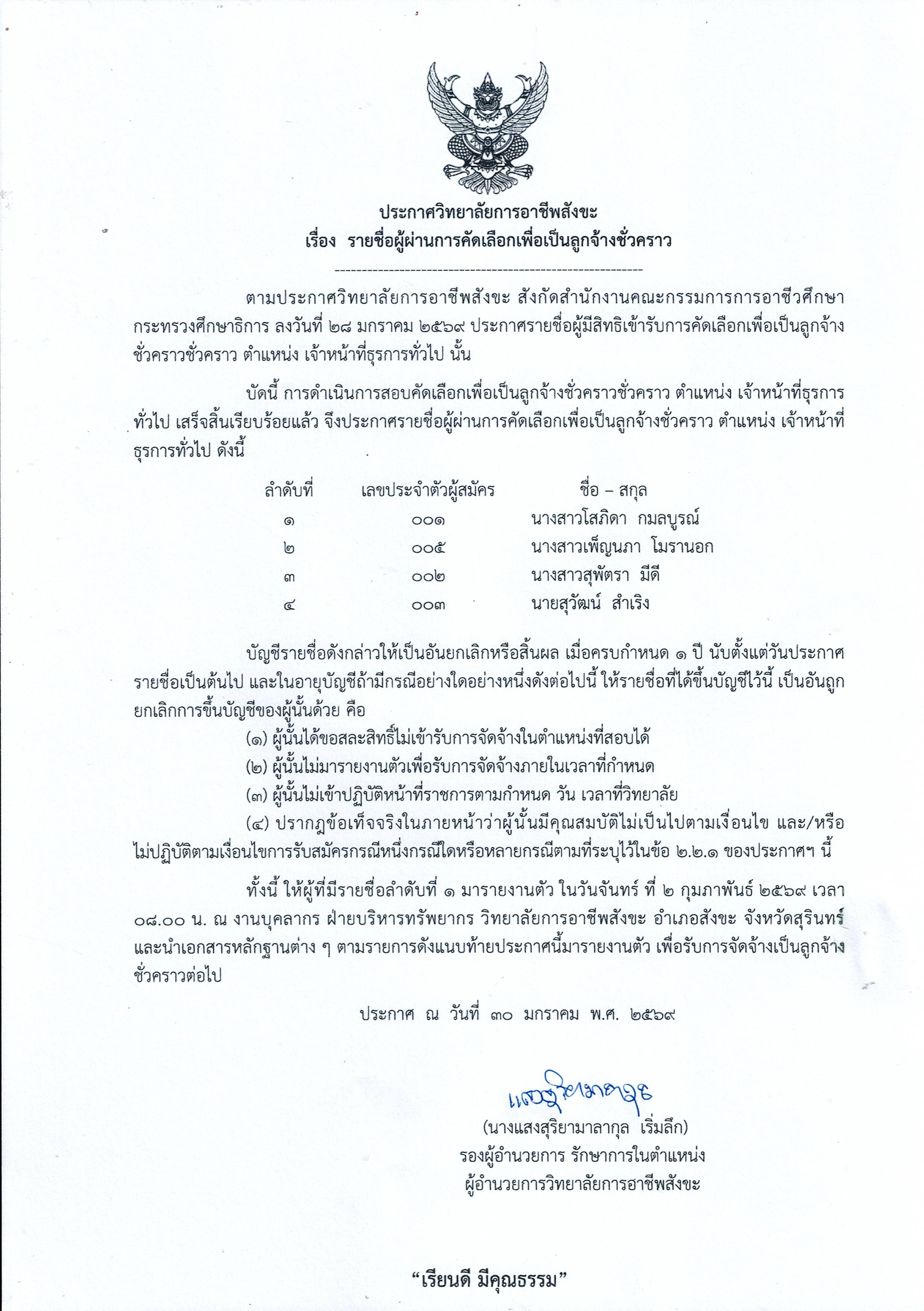 ประกาศรายชื่อผู้ผ่านการคัดเลือกเพื่อเป็นลูกจ้างชั่วคราว