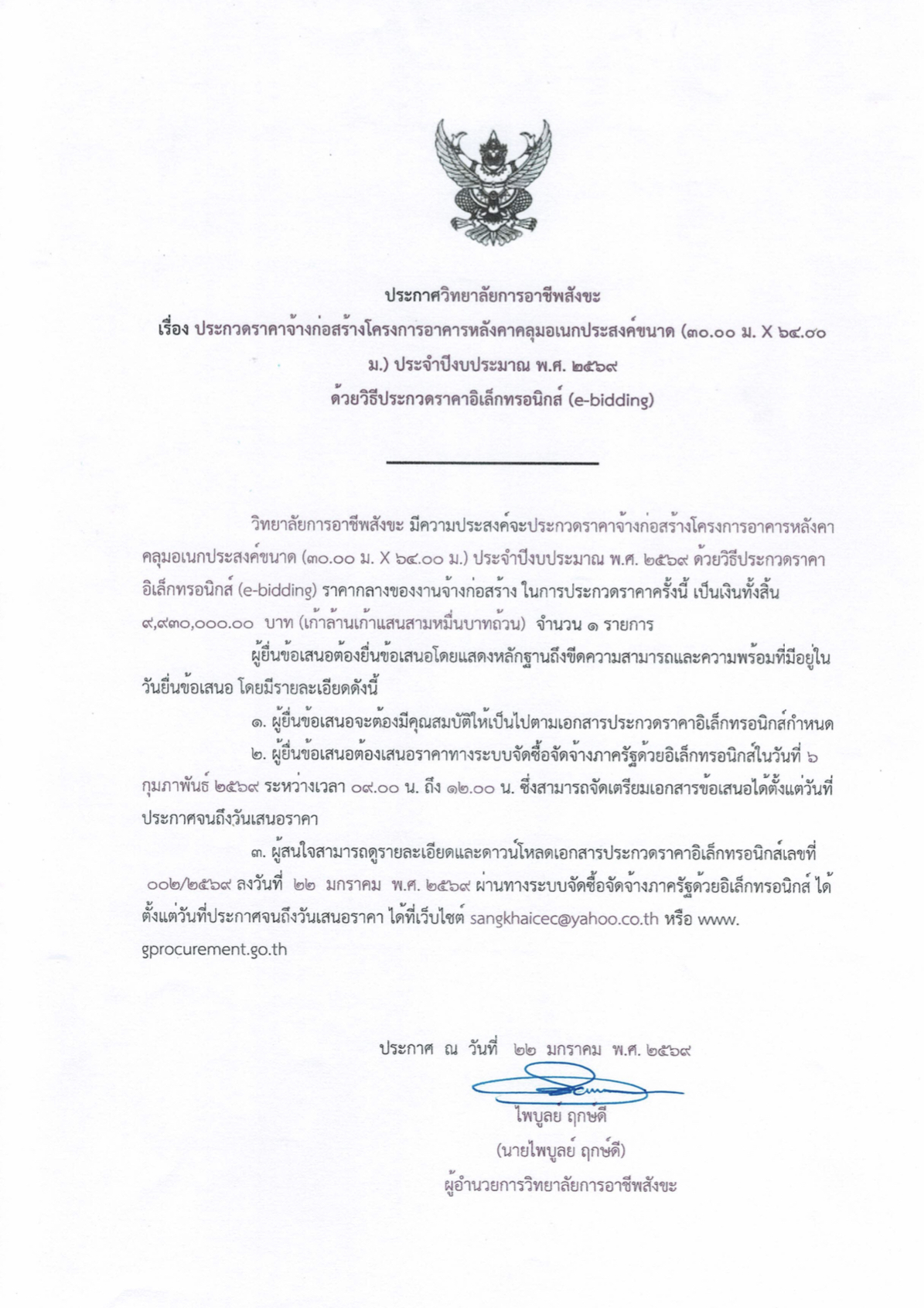 ประกาศประกวดราคาจ้างก่อสร้างโครงการอาคารหลังคาคลุมเอนกประสงค์ขนาด (30.00 ม. X 64.00 ม.) ประจำปีงบประมาณ 2569