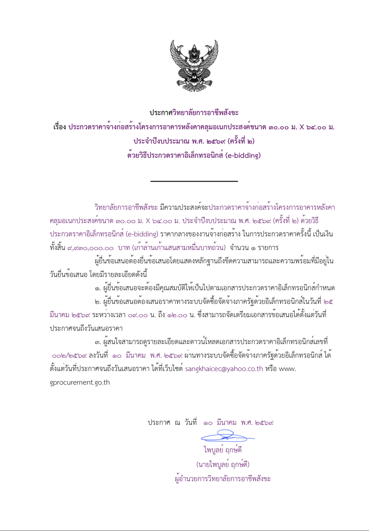 ประกวดราคาจ้างก่อสร้างโครงการอาคารหลังคาคลุมอเนกประสงค์ขนาด ๓๐.๐๐ ม. X ๖๔.๐๐ ม. ประจําปีงบประมาณ พ.ศ. ๒๕๖๙ (ครั้งที่ ๒) ด้วยวิธีประกวดราคาอิเล็กทรอนิกส์ (e-bidding)
